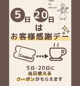 毎月5日と20日はポイント5倍!★併設カフェの感謝デーも同時開催中♪《スキレット日記:2026-3-20@スキレット》